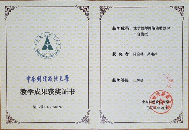 2004年我主持申报了一个湖北省高校教研项目,项目名称叫“法学专业网络辅助教学模式研究”,这个项目获得了立项和资助。因为申报的需要,我专门设计制作了一个我称之为“LawTTN”(《法学教师网络辅助教学平台模型》)的网站模板。LawTTN 即 Law Teacher's Teaching Network-platform 的缩写。我为这个网站正式注册了一个域名“huilin.info”,提供服务器(租赁)的是当时国内最大的网商“中国万网”【参见图B】。这个项目的结项成果“LawTTN”在2009年还获得了中南财经政法大学教学成果二等奖。【参见图C】
